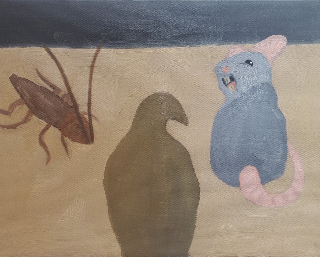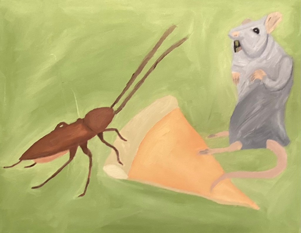 “Ratón, Roachelle, and Coo-Coo-Cooper” (2024). Oil on 24″ x 36″ Canvas