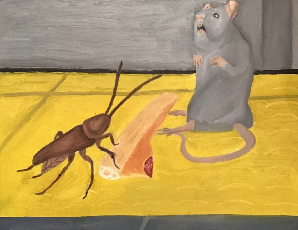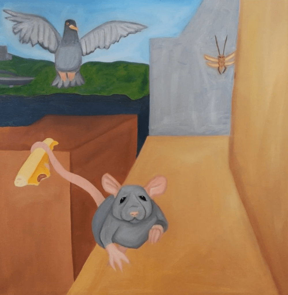 “May the Best Rodent Win” (2024). Oil on 36″ x 36″ Canvas