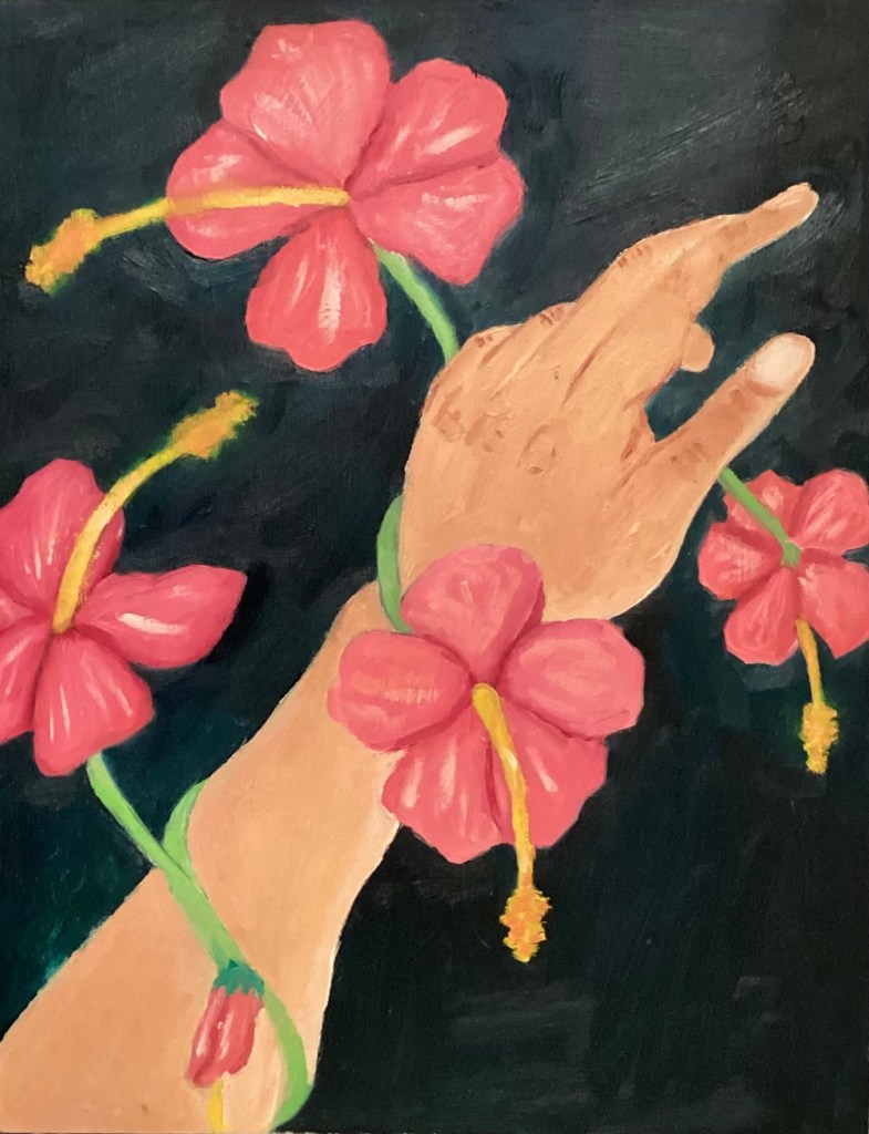 “Hibiscus Bloom” (2023). Oil on 11″ x 14″ Wood Panel
