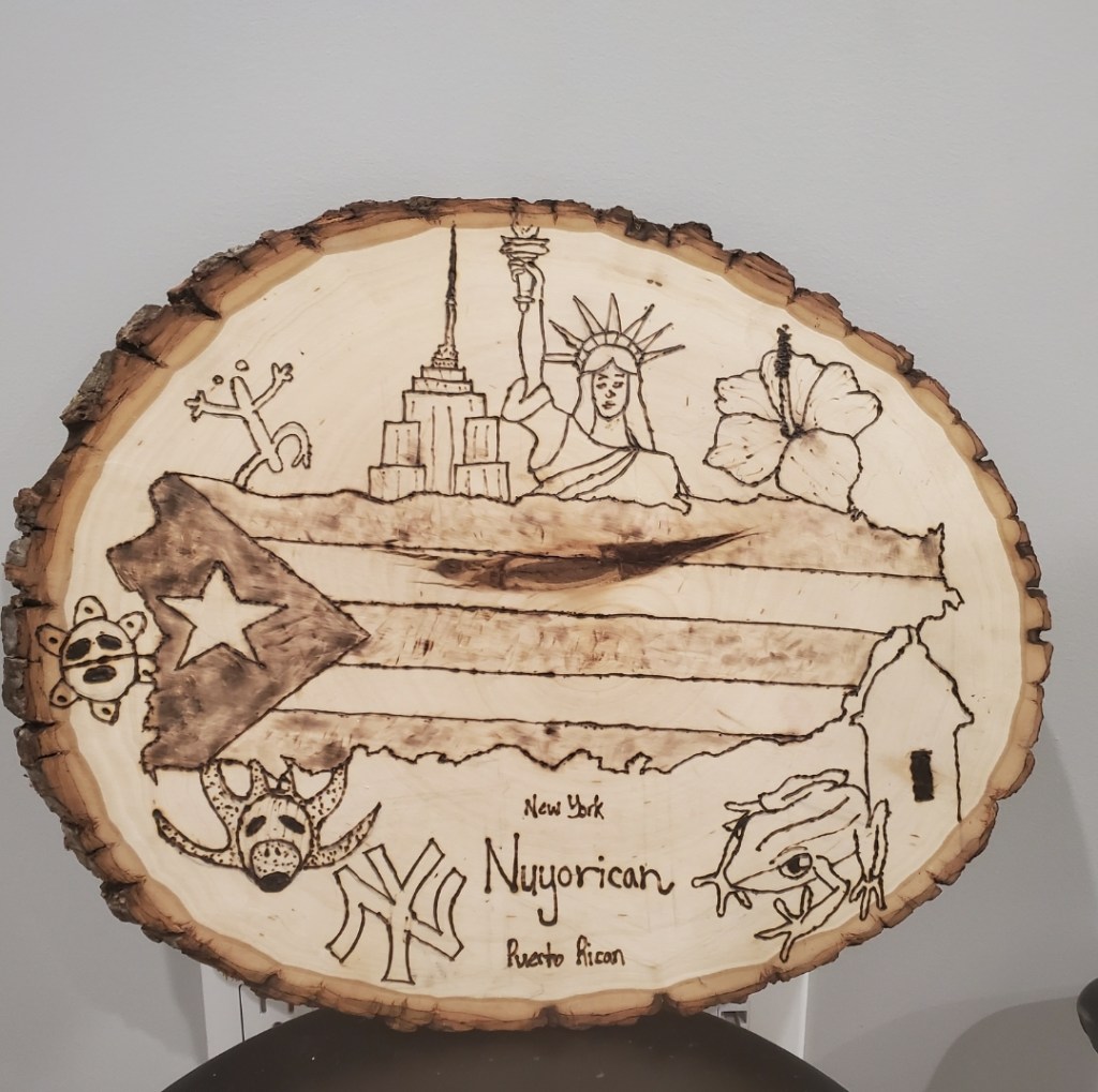 “Nuyorican” (2022). Woodburning on 12 x 16 Wood