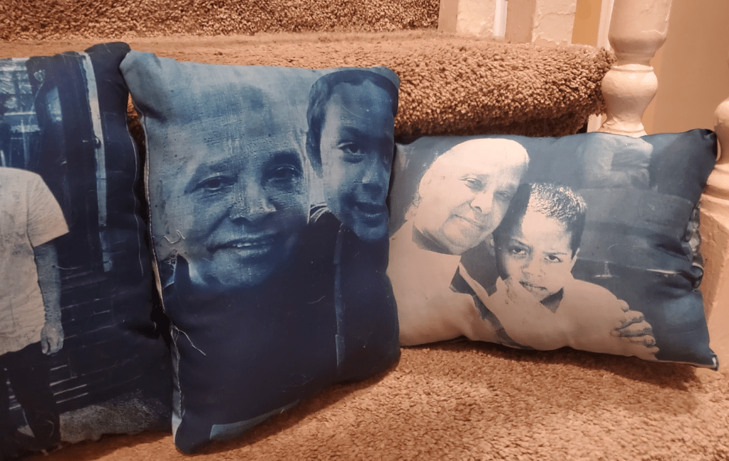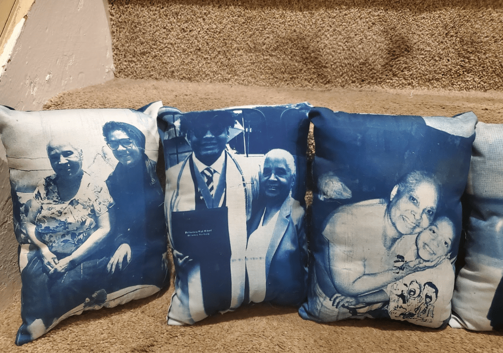 “Mi Abuela y Yo” (2024). Cyanotype Pillows on 8.5″ x 11″ Pretreated Fabric Prints